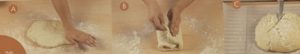 • haal de deegbal uit de kom, bestrooi hem met bloem en snij met nat mes de bol in.